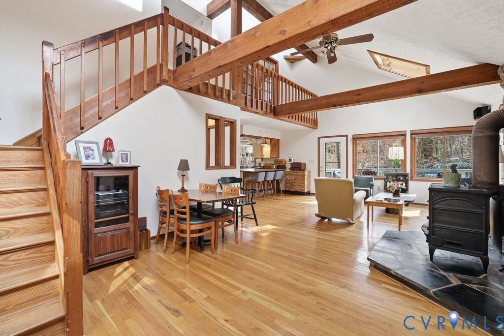 Feel like you're living in a mountain retreat just 10 minutes from downtown Richmond and within walking distance of Pony Pasture and the James River. This cozy contemporary home offers 2 bedrooms and 3 full bathrooms. Step inside to vaulted ceilings, exposed wood beams, and a striking wood accent wall. The family room features a stone hearth and stone feature that goes up the wall and a wood-burning stove, plus skylights and large windows that fill the space with natural light. It flows into an eat-in kitchen with stainless steel appliances. At the back of the home, you'll find a bright sunroom overlooking the private yard. The first floor also includes a bedroom and a full hall bathroom. Upstairs, a lofted area leads to the primary suite, complete with vaulted ceilings and an en-suite bath with a vanity, soaking tub, and separate shower. An additional office space is located on the second level. The basement offers both storage and flexible living space, with a partially finished area and a finished section that includes a living room, full bathroom, and a large room that could be used as a bedroom. A utility room with a sink is tucked behind the built-in shelves. Outside, enjoy a private yard and wraparound deck, perfect for relaxing or entertaining & extra storage unit under the deck. This house also has an electric car charging station and gas powered generator. Conveniently located just minutes from Trader Joe's, Chippenham Parkway, downtown Richmond, and local dining. Recent updates include; roof 2024 & outside siding stained 2024.